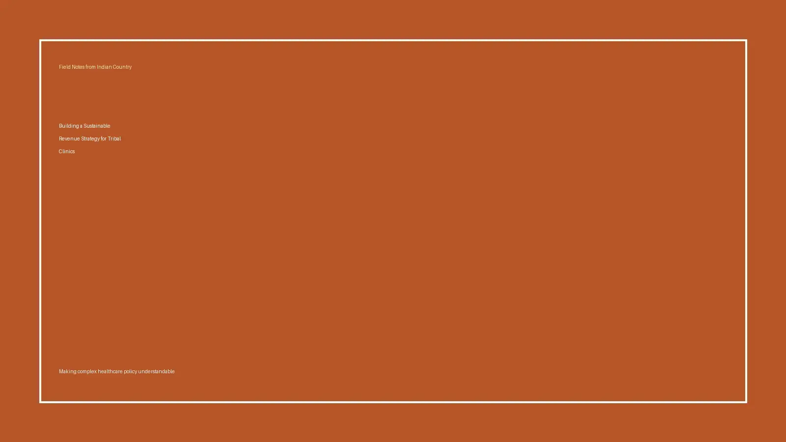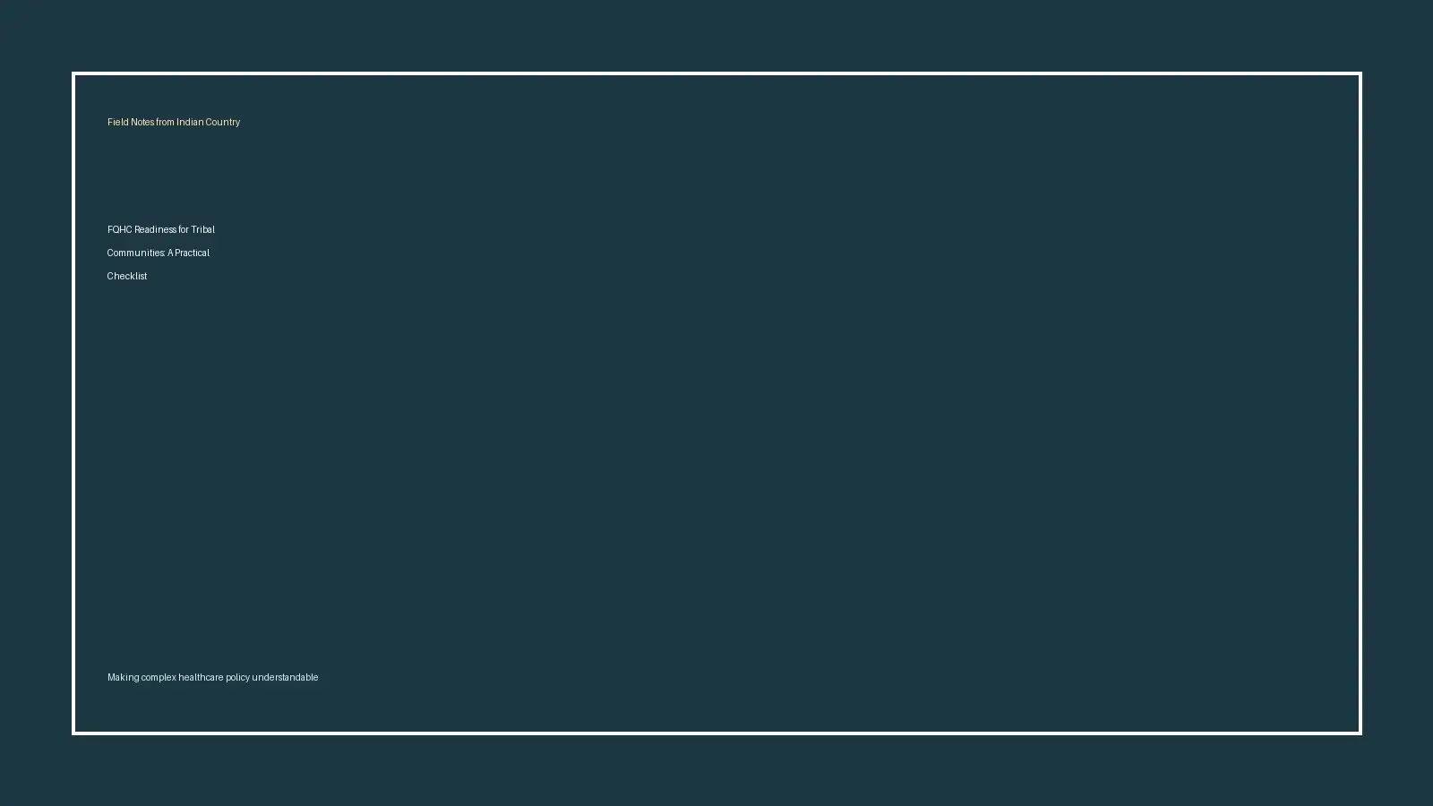 Field Notes covers 638 self-determination, FQHC readiness, board and leadership alignment, revenue strategy, compliance, workforce stability, CMS and IHS policy interpretation, and healthcare sovereignty in practice.
